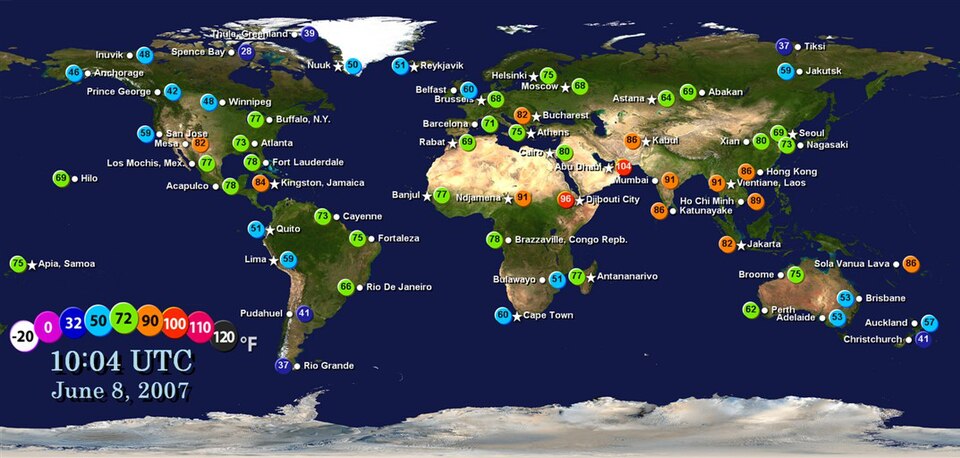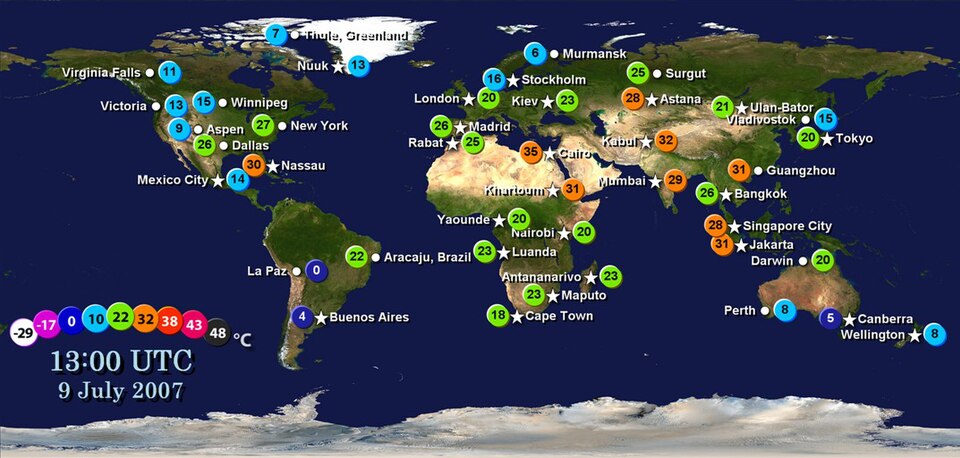 Wikinews Weather Service (BETA) temperatures of select global cities.